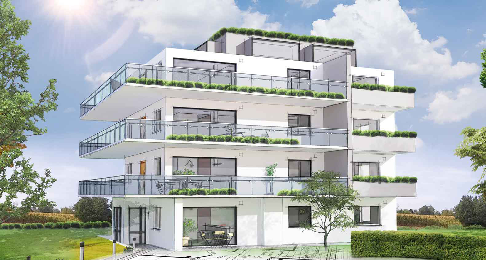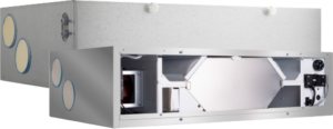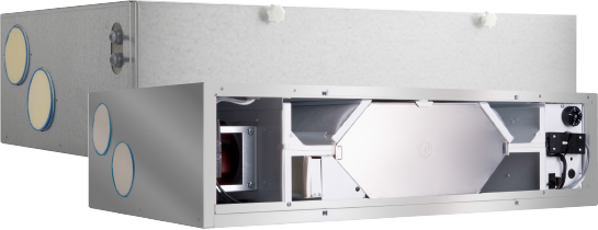 Extrem flache Zentralgeräte mit Wärmerückgewinnung für mehrgeschossigen Wohnungsbau, Niedrigenergiehaus, Passivhaus, etc. zur raumsparenden Deckenanordnung